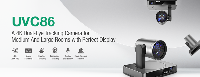 ה‑Yealink UVC86 היא מצלמת ועידה מתקדמת במיוחד, המיועדת לחדרי ישיבות בינוניים עד גדולים. היא משולבת מפני מצלמה פרוספקטיבית רחבה (panoramic) עם מצלמת PTZ (Pan/Tilt/Zoom), ומפעילה אלגוריתמים חכמים כמו זיהוי משתתפים, מעקב דובר, ומעקב מציג.