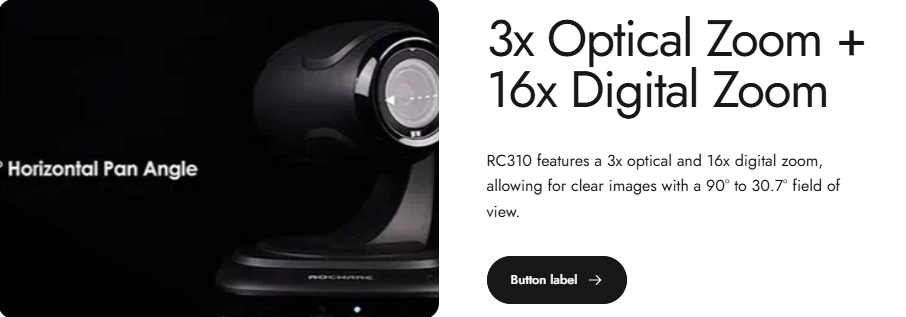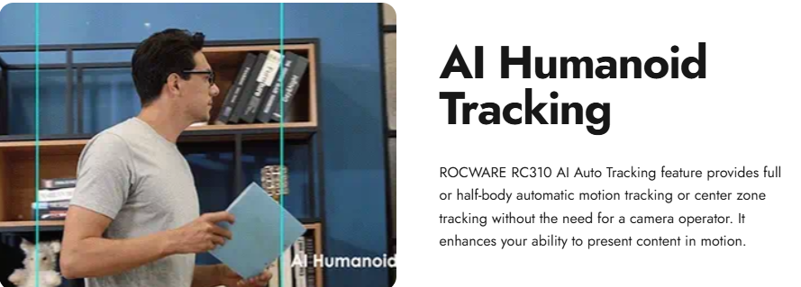 ה־Rocware RC310 היא מצלמת PTZ מיני מתקדמת במיוחד לצרכי כנסים, פגישות וידאו ויישומי UCC. המצלמה משלבת קומפקטיות עם ביצועים גבוהים — כולל תנועה בזוויות רחבות, זום אופטימי ותמיכה באלגוריתמים חכמים לזיהוי ומעקב.