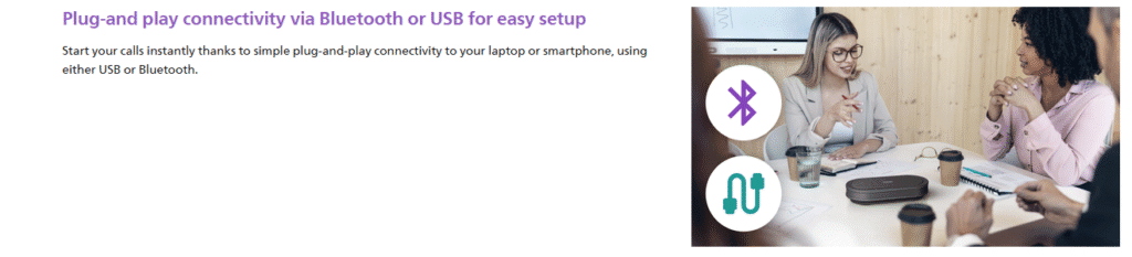 תפעול פשוט ב-Plug & Play ממחשב נייד, מסמארטפונים בחיבור USB או בתקשורת אל-חוטית Bluetooth. מיקרופון ועידה אלחוטי להקלטות ישיבות ברורות