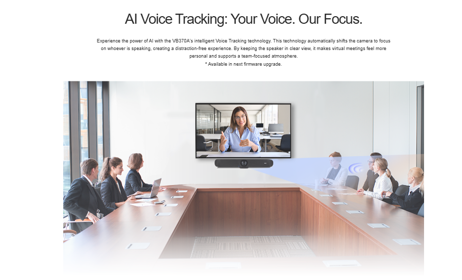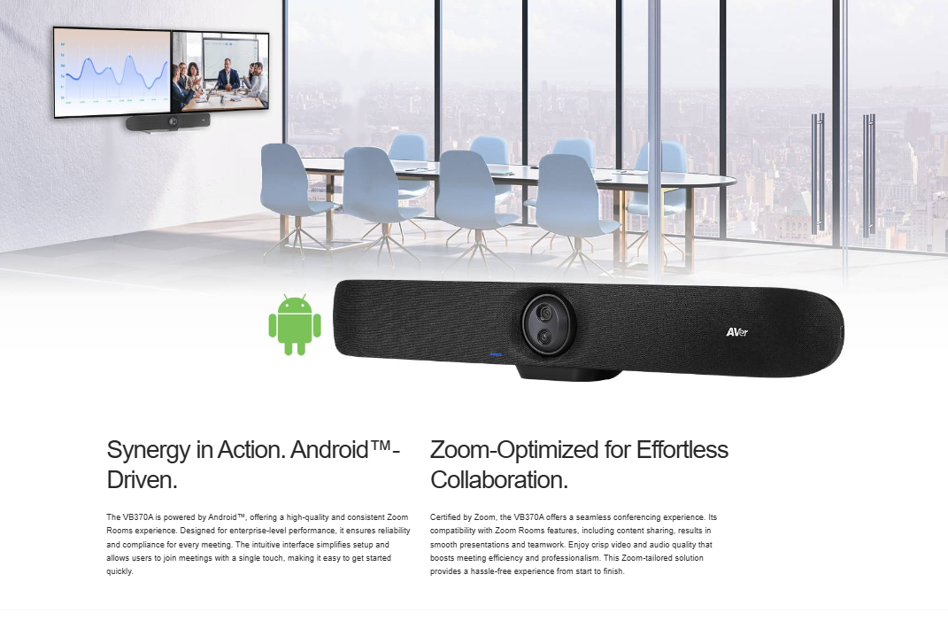 ה-AVer VB370A הוא פתרון פס ועידה (Video Bar) מתקדם המיועד לחדרי ישיבות, הכולל שתי מצלמות 4K בעלות עדשות כפולות, מערך מיקרופונים מובנה, ומערכת הפעלה אנדרואיד מובנית. הוא מותאם לשימוש עם Zoom Rooms, מציע יכולות זום חכמות באמצעות בינה מלאכותית, תמיכה במסכים כפולים להצגת תוכן ודוברים בו-זמנית, וכן תאימות לאביזרי הרחבה כמו מסכי מגע, להגברת הגמישות וההתאמה לכל גודל חלל.