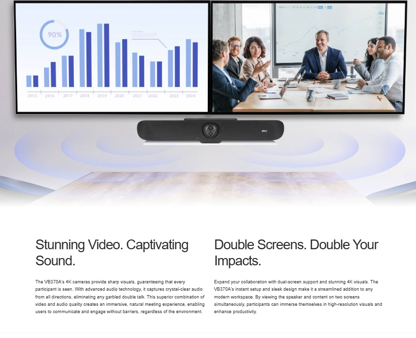 VB370A של AVer – וידאו-בר 4K עם עדשה כפולה – מספק איכות וידאו ואודיו מעולה, כך שכל משתתף ירגיש נוכח באמת.