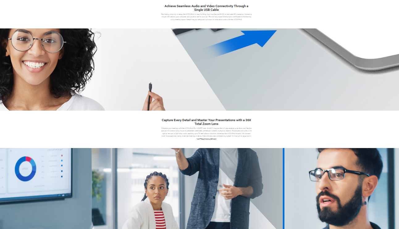 הפיצ'ר Smart Composition – פונקציית בינה מלאכותית (AI) מובנית – מאפשר צילום תקריב איכותי של משתתפי הפגישה בצורה אוטומטית. בשילוב עם פתרון רמקול מורחב, ה‑VC520 Pro3 מספקת חוויית וידאו קונפרנס ברמה שאין לה תחרות.