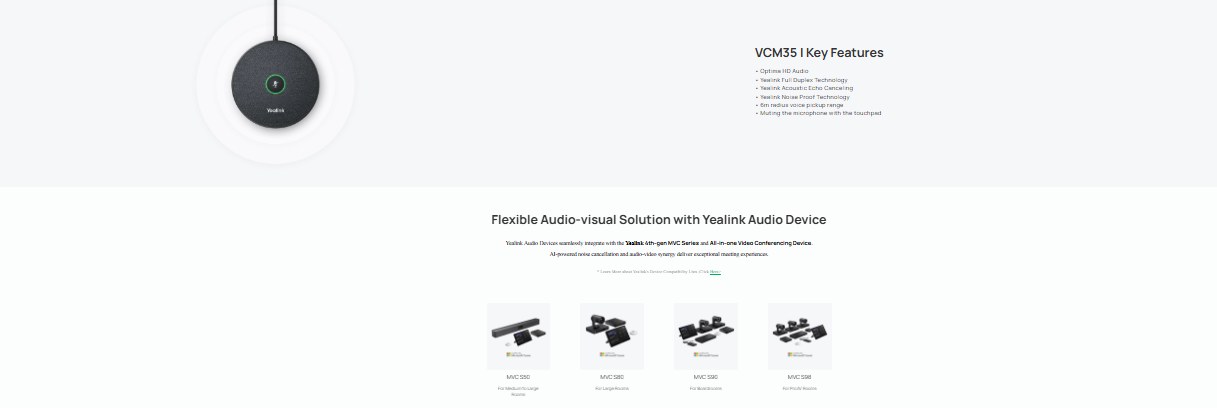 ה‑Yealink VCM35 הוא מערך מיקרופונים קווי (wired microphone array) המיועד במיוחד לשימוש במערכות ועידה של Yealink. המיקרופון כולל שלושה אלמנטים (microphones) איכותי, המספק קליטת קול ב-360° בטווח של עד 3 מטרים, עם טכנולוגיות מתקדמות לביטול רעשים .