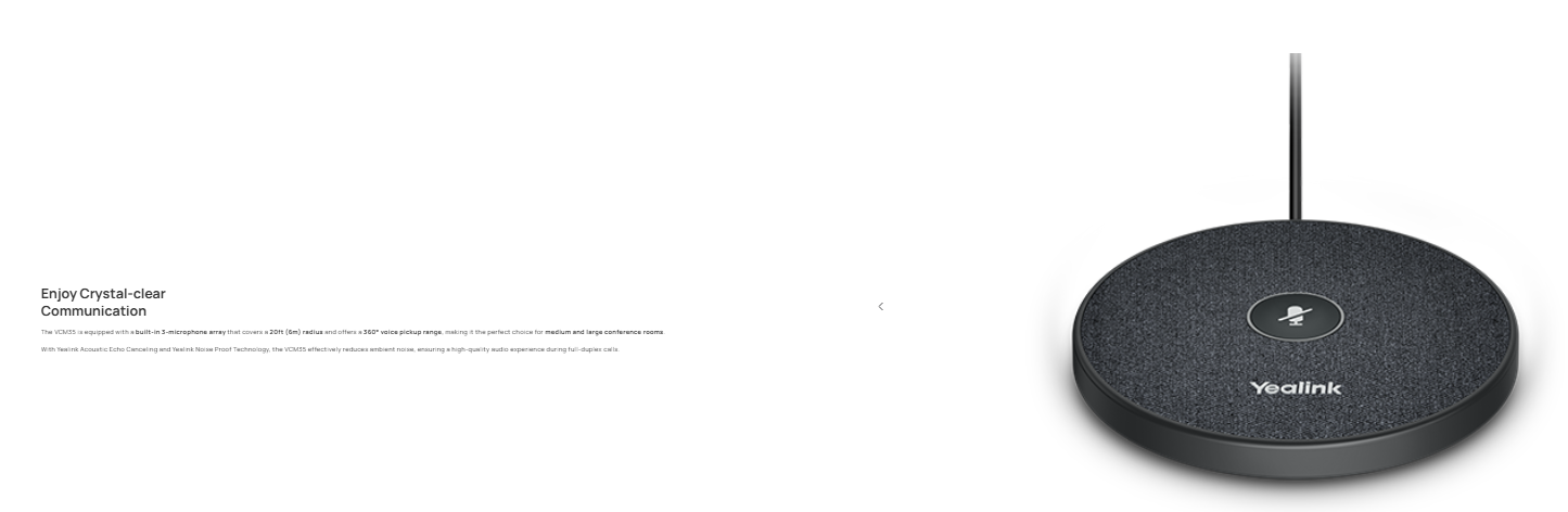 Yealink VCM35 הוא מיקרופון מתקדם מבוסס IP, המיועד לספק פתרון שמע איכותי במיוחד עבור מערכות ועידה של Yealink, כגון סדרות MVC ו-MeetingBar. המיקרופון נבנה מתוך הבנה עמוקה של צרכי שיחות הווידאו והאודיו בעידן העבודה ההיברידית, והוא מספק קליטת קול מדויקת, טכנולוגיית סינון רעשים חכמה ועיצוב אלגנטי שמותאם במיוחד לחדרי ישיבות מודרניים – ממרחבים קטנים ועד לחדרי ישיבות גדולים ומורכבים.
