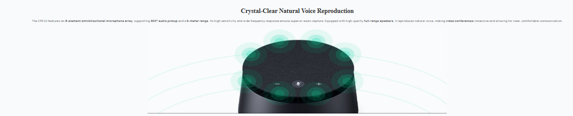 המיקרופון מצויד בטכנולוגיית קליטה אומני-דירקשנלית (Omnidirectional) המאפשרת קליטה של דיבור בטווח של עד 3 מטרים ובזווית של 360 מעלות, כך שגם משתתפים המרוחקים מהטלפון המרכזי נשמעים באופן ברור וטבעי. בין אם מדובר בפגישות צוות קטנות או בשיחות ועידה עם משתתפים רבים – CPE40 מבטיח שכל קול יישמע.